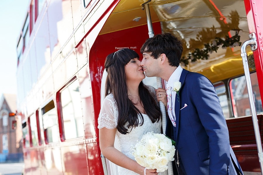 After a week of rain, Saturday was a scorcher, already up to 30 degrees when I arrived to cover Charlotte’s preparations at their lovely light filled home. Charlotte’s mum’s reaction when she saw her dressed and ready was priceless just before I headed out the door to the church the find Casey greeting guests in the brilliant sunshine. After the service, the guests travelled by Routemaster bus to their unique reception venue – the 1920’s art deco Arlington Ballroom in Southend.