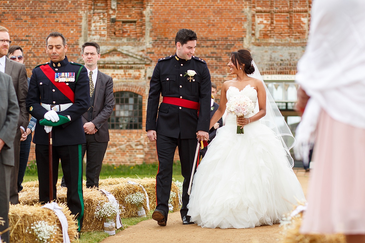 Everyone was staying at the adjoining Godwick Hall so the preparations were relaxed and in full swing when I arrived. Rob was greeting his guests in the barn while Sam was applying the final touches before hopping onto the back of Godwick’s vintage tractor with her maid of honour for the short trip over to the barn for the ceremony. The ceremony was super relaxed with all the guests seated on hay bails and with the picturesque ruins of Godwick church in the background. Being big Disney fans, Wall-E was on hand to assist the best man in presenting the rings.
