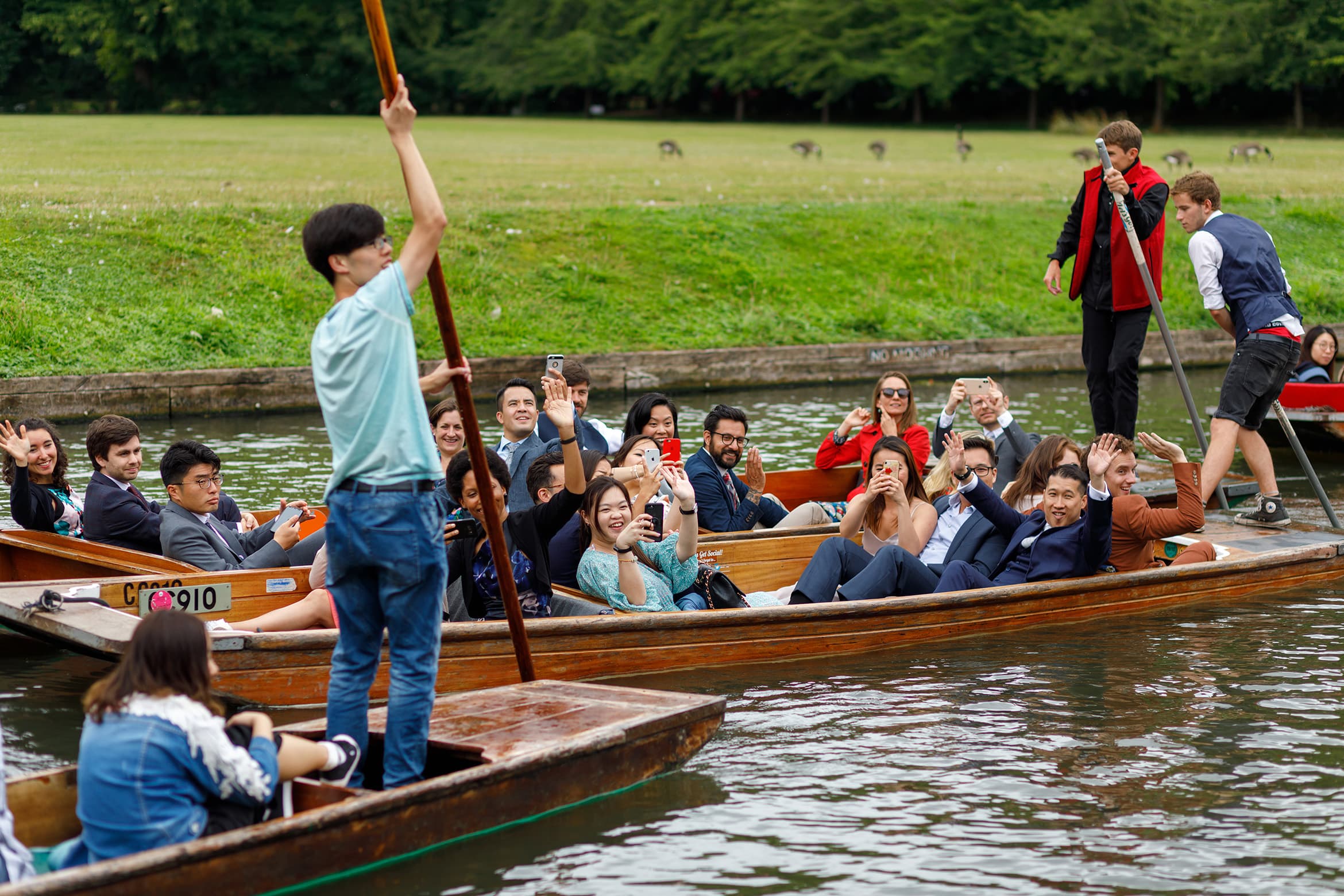 The rain stopped just in time for a group photo of everyone on the Tribune steps before everyone was seated in the Trinity dining hall for the celebration lunch. After the lunch, Geoff and Angella gave a short speech of thanks before guests left in groups for the most Cambridge of activities – punting tours! A brave call on such a wet day but again our luck held out and the weather turned warm and bright.