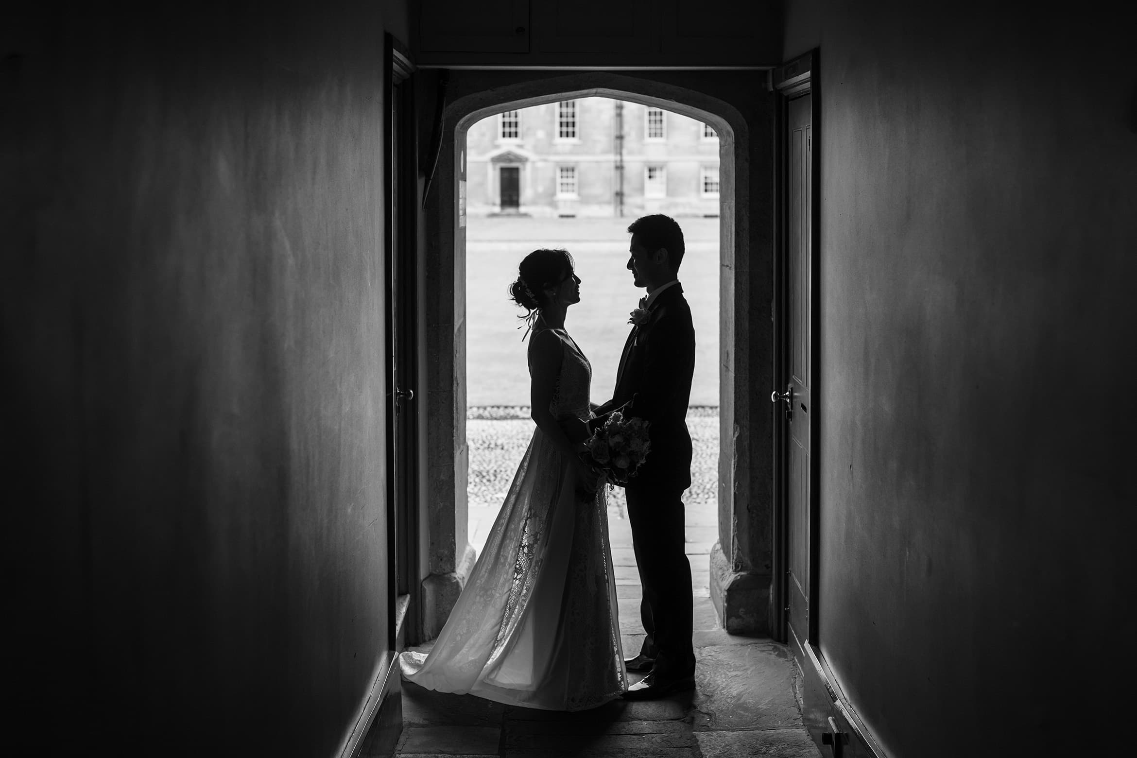 The previous week had seen a new record set for the UK’s hottest day ever. 38 degrees might have been a little uncomfortable for a wedding day but by the weekend the temperature had cooled. Unfortunately, this also brought some rain so we started the day under umbrellas. Luckily Trinity College is well equipped for a wet wedding day and guests gathered in the cloisters of the Wren Library to enjoy some welcome drinks and greet their bride and groom.